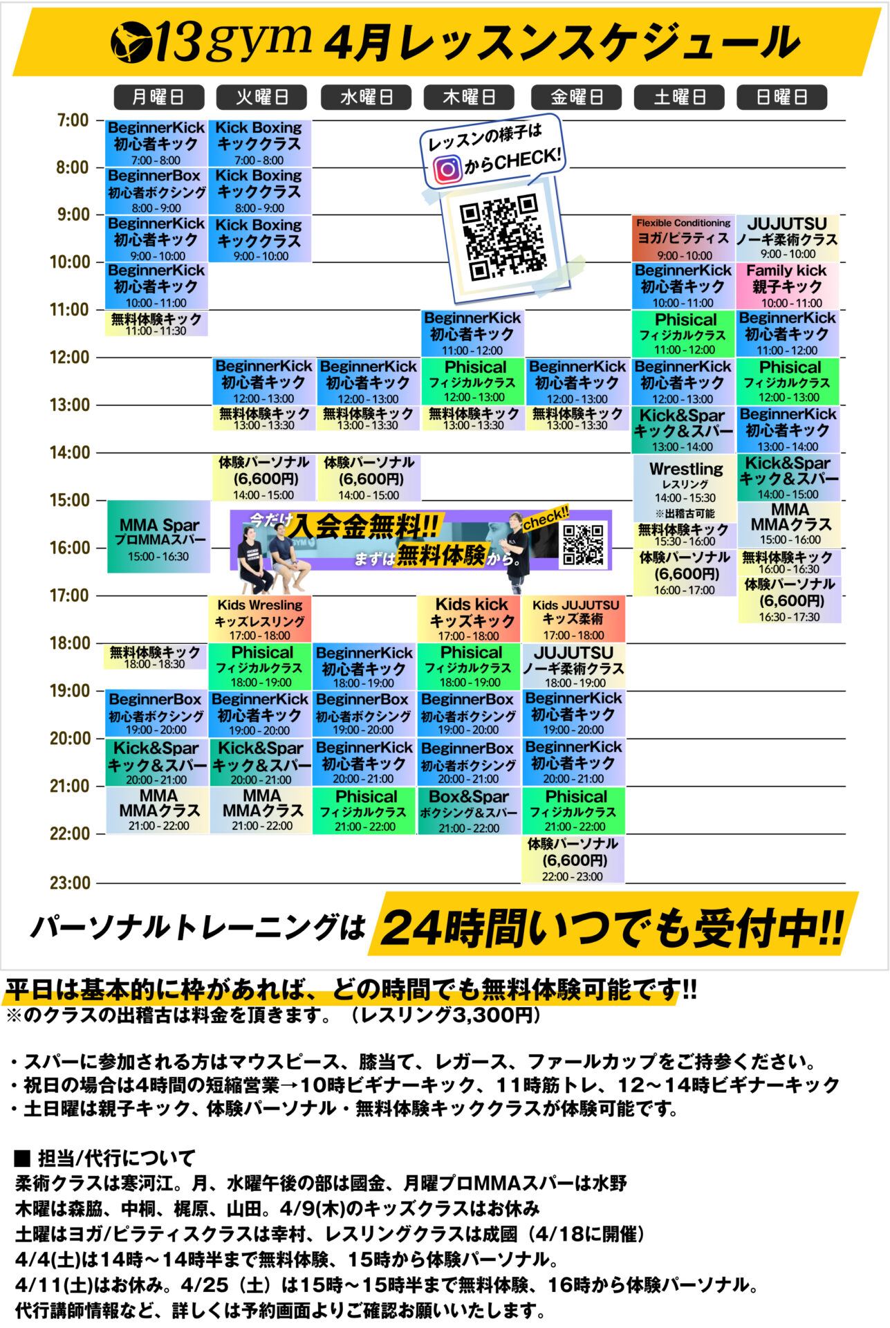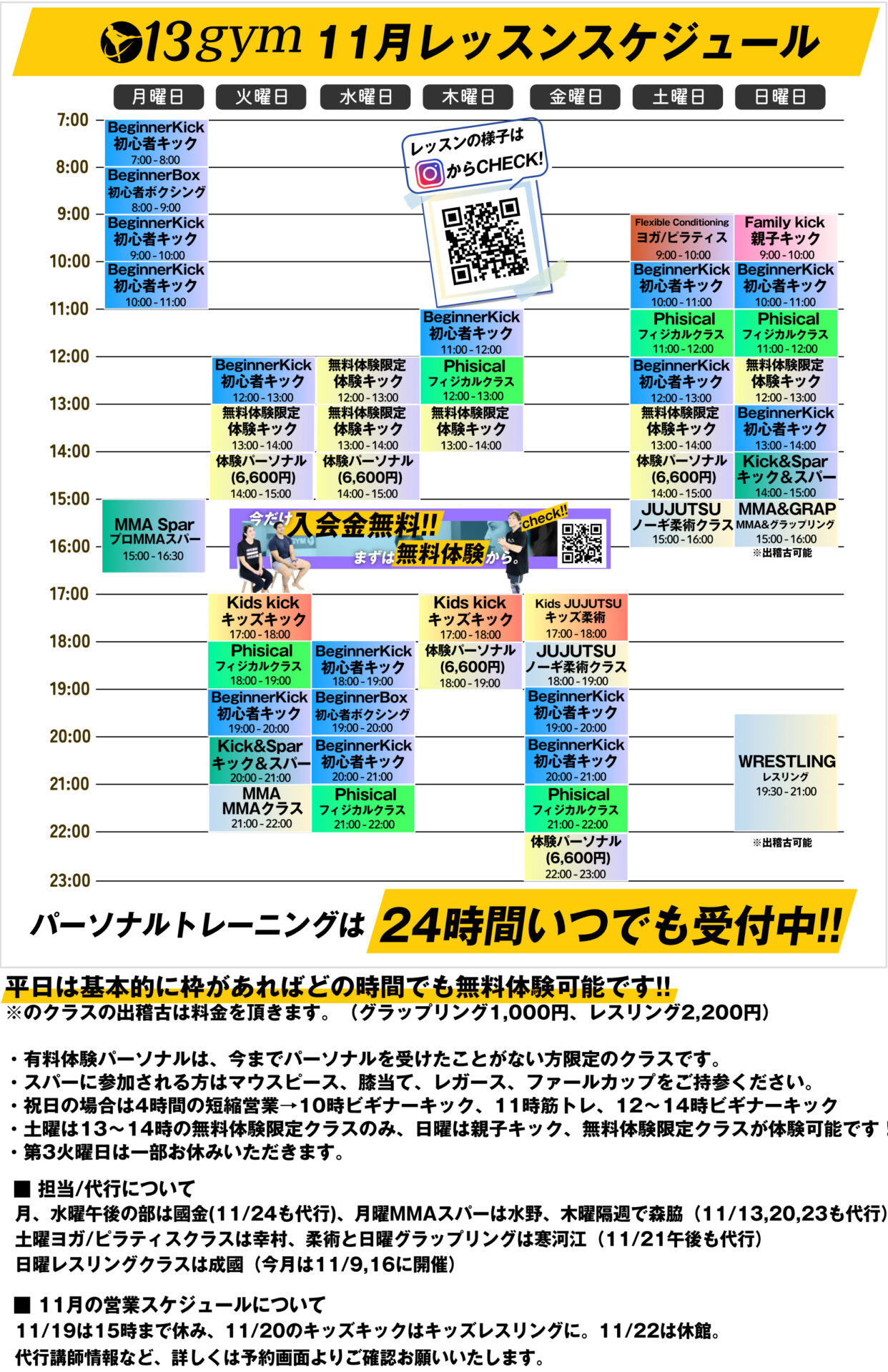日曜日は親子キック、無料体験限定クラス、MMAクラスが体験可能です。